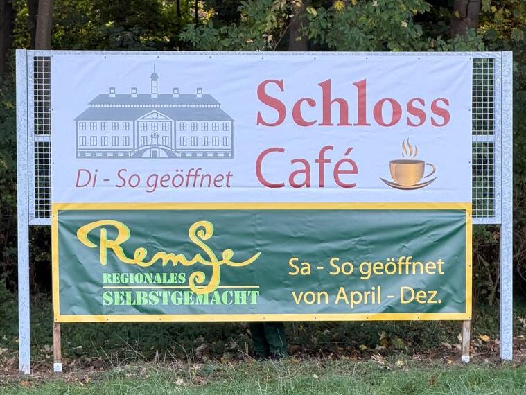 Viele Jahre stand an der B 109, dem Zubringer zur A 20, auf Höhe des Schlosses ein großer Aufsteller, der auf Schloss und Park hinwies. Dieser ist in die Jahre gekommen und der Zahn der Zeit hat mit seinen Witterungseinflüssen dafür gesorgt, dass die Stürme des letzten Jahres ihr Übriges tun konnten.